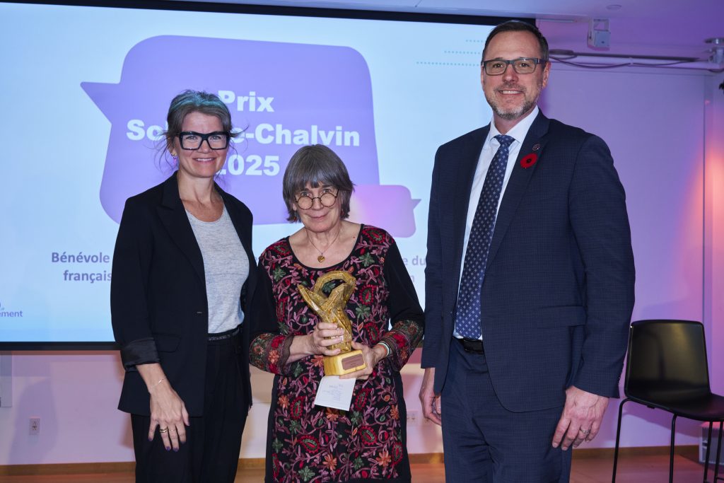 Karine Dumont, sous-ministre de l’Immigration, de la Francisation et de l’Intégration ; Sylvie Gendron, lauréate de la catégorie Bénévole qui accompagne des personnes en apprentissage du français au sein d’un organisme partenaire en francisation ; Jean-François Roberge, ministre de l’Immigration, de la Francisation, et de l’Intégration, ministre de la Langue française et ministre responsable des Relations canadiennes et de la Francophonie canadienne. (Photo: Julien Faugère)