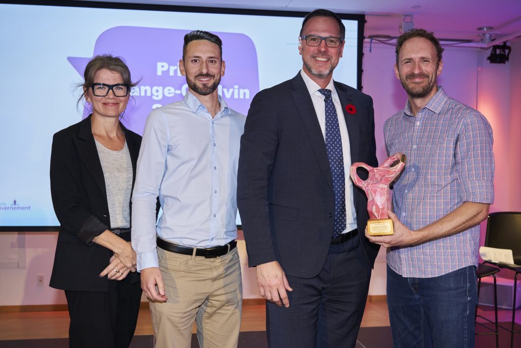 Karine Dumont, sous-ministre de l’Immigration, de la Francisation et de l’Intégration ; Manuel Lefebvre et Alexandre Mercier, lauréats de la catégorie Personnel enseignant du MIFI ; Jean-François Roberge, ministre de l’Immigration, de la Francisation, et de l’Intégration, ministre de la Langue française, et ministre responsable des Relations canadiennes et de la Francophonie canadienne. (Photo: Julien Faugère)