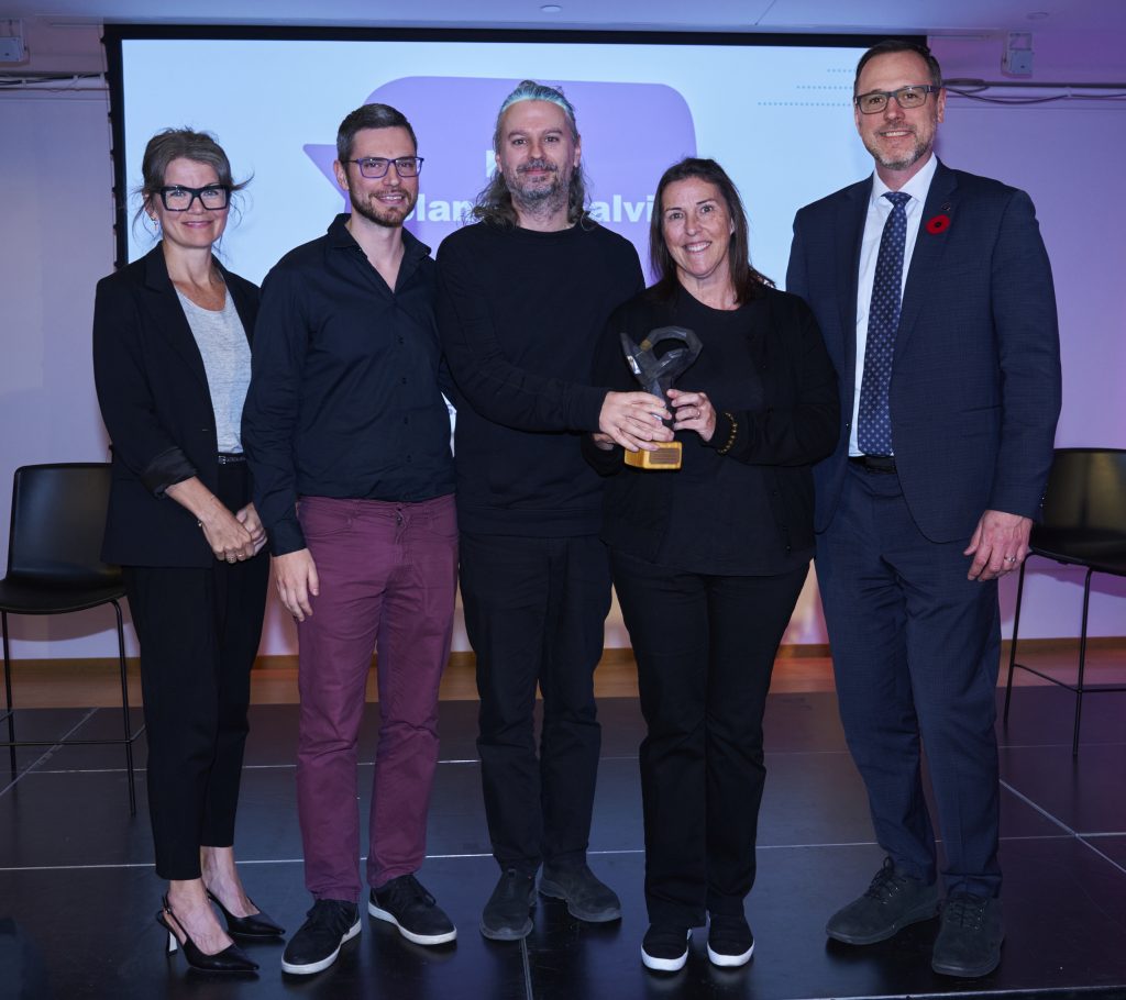 Karine Dumont, sous-ministre de l’Immigration, de la Francisation et de l’Intégration ; Nadine Petit, intermédiaire linguistique et culturelle — Services aux immigrants ; Karl Normand, agent de services sociocommunautaires et Mélissa Sarrazin Le Siège, directrice générale par intérim, Centre de la communauté sourde du Montréal métropolitain, lauréat de la catégorie Partenaires du MIFI en apprentissage du français : Organisme à but non lucratif ; Jean-François Roberge, ministre de l’Immigration, de la Francisation, et de l’Intégration, ministre de la Langue française et ministre responsable des Relations canadiennes et de la Francophonie canadienne. (Photo: Julien Faugère)