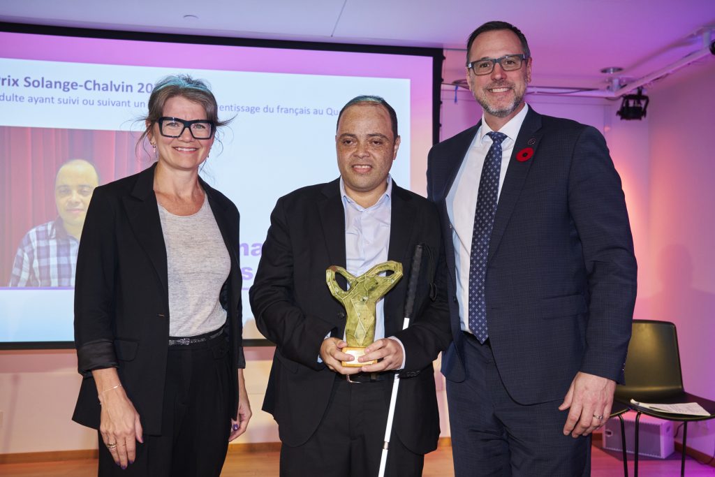 Karine Dumont, sous-ministre de l’Immigration, de la Francisation et de l’Intégration ; Hernan Camilo Arias Barrientos, lauréat de la catégorie Adulte ayant suivi ou suivant un parcours d’apprentissage du français au Québec ; Jean-François Roberge, ministre de l’Immigration, de la Francisation, et de l’Intégration, ministre de la Langue française, et ministre responsable des Relations canadiennes et de la Francophonie canadienne. (Photo: Julien Faugère)